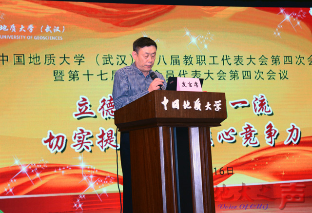 (地大之声记者徐燕 摄影张玉贤)5月16日下午,我校第八届教职工代表大会第四次会议暨第十七届工会会员代表大会第四次会议在弘毅堂闭幕。全校300余名教职工代表参加会议。 校党委副书记、工会主席成金华主持会议。 校工会副主席杨茜作代表团讨论意见汇总报告。校工会副主席高复阳作提案工作报告,汇报了2016年提案落实情况。 会议审议并通过了“关于校长工作报告的意见”、“关于工会工作报告的决议”和“关于校学术委员会工作报告的意见”。 围绕大会主题,党委宣传部部长喻芒清、人事处处长张宏飞、教务处处长殷坤龙、研究生院常务副院长周爱国分别作了《找准问题 聚焦重点 创新举措 精准施策 全面贯彻落实高校思想政治工作会议精神》《追求学术卓越,建设高水平师资队伍》《从“目标”走向“实现”——谈一流本科人才培养》《严格培养要求,创新培养模式,不断提高博士研究生培养质量》的发言;地球科学学院院长刘勇胜、材料与化学学院院长夏帆、计算机学院院长王力哲先后作了《新起点、新思维、新高度——地质学一流学科建设的思考与思路》《以试点谋发展,以改革创一流》《提高人才培养质量,建设高水平计算机学科》的发言。