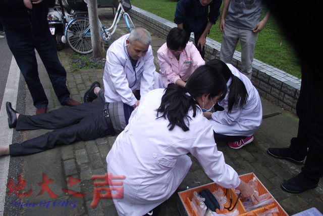 (地大之声记者徐燕)4月27日中午,在我校校园内发生了感人一幕:师生接力救助了一名突发心梗的张姓老人,谱写了一曲爱心之歌。 原来,当天中午1时40分,在路过马克思主义学院办公楼门口时,资源学院大四学生史邵贤、大二学生汪襄南和地学院大二学生何鑫发现一位老人晕倒在地,当即把老人扶至阴凉处,并拨打120急救电话呼救。 听到呼救声,正在午休的保卫处户政科长张伟迅速赶到老人身边。他用手一摸,发现老人已没有呼吸。他迅速拨打120急救电话,并按照120急救医生的指导,把老人放平,为其做胸部按压。两分钟后,只听老人舒出一口气,张伟心中一喜,继续为老人施救。 与此同时,校医院主任医师朱乐夫、医师桑娟、护士长蒋巧辉、护士冯天杰已坐上保卫处副处长单红峰派来的巡逻车,背着急救箱、氧气包,拿着血压计迅速赶了过来,给老人进一步抢救。“快!给他做心肺复苏!”朱乐夫喊道。他一下车,立刻蹲下来给老人进行持续的胸部按压,其他医护人员也各就各位,做着各种应急准备。 14时05分,120救护车赶来,给老人进行了心脏复苏电击术,并注射了药物。经过半小时的抢救,老人的心脏恢复了跳动。随后,老人被120救护车送往武汉市第三医院(光谷院区)救治。