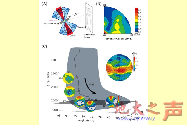 (地大之声通讯员翁华强)4月18日,地质过程与矿产资源国家重点实验室巫翔教授及国际研究合作团队在《自然》子刊《自然通讯》杂志发表题为《D′′层地震波的各向异性源于后钙钛矿(001)变形》的论文,首次通过高温高压实验,获得了核幔边界主要物质(Mg,Fe)SiO3后钙钛矿的变形组构,揭示了下地幔底部地震波速传播的各向异性机理。 地球经历漫长演化过程形成了圈层的内部结构:地壳、地幔和地核。下地幔底部D层(距离地表2700-2900公里),作为固态地幔和液态外核的过渡区,控制着核幔边界物质和能量的交换、地幔对流等动力学过程,呈现了丰富的物理化学现象。如,剪切波在D层特定区域存在水平方向传播速度比垂直方向的快1-2%,推测与其主要物质(Mg,Fe)SiO3后钙钛矿晶体的定向排列相关。这种(Mg,Fe)SiO3后钙钛矿在常温常压条件下会转变为非晶质,它只能在压力大于120万个大气压和温度大于2000度条件下才能稳定存在。因此,如何通过高温高压实验方法获得后钙钛矿在如此极端条件下的变形机制,成为地球深部物质过程研究的难点。 金刚石是自然界最硬的材料,将两颗金刚石压砧对顶,能够产生上百万个大气压,同时在压砧面上产生的差应力,会诱导物质发生变形。这种变形过程可以通过X射线衍射技术进行时时监控。利用这些技术的特性,地质过程与矿产资源国家重点实验室深部物质研究团队巫翔教授和美国德克萨斯大学林俊孚教授合作的国际研究小组设计了一套系统,能原位地监测了后钙钛矿在D层温压条件下的变形过程(图A, B),获得了其滑移面为(001)。此滑移属于后钙钛矿的变形产生而非布里奇曼石到后钙钛矿的相变产生。这种变形机制会引起剪切波速波在水平偏振方向快于垂直偏振方向(~3.7%) (图C),合理地解释环太平洋边缘下D层剪切波速传播行为,对我们理解下地幔底部物质过程、地幔对流等动力学机制有重要意义。 巫翔教授为第一作者,他和林俊孚教授同为通讯作者,Pamela Kaercher博士、毛竹教授、刘锦博士、Hans-Rudolf Wenk教授和Vitali Prakapenka博士参与了此项研究。项目得到了国家自然科学基金重点项目资助和美国阿贡国家实验室先进光子光源研究项目支持。 论文链接:“https://www.nature.com/articles/ncomms14669”
