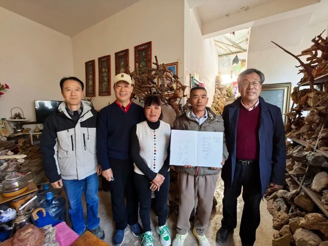 龚一鸣教授(左一)冯庆来教授(左二)童金南教授(右一)为施甸化石爱好者段明华夫妇题字并赠书