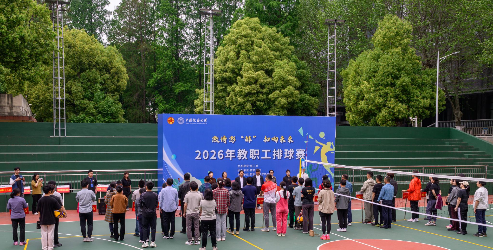 地大新闻网讯 春日焕新,赛场燃情。为庆祝湖北省总工会成立100周年,丰富教职工精神文化生活,展现新时代教职工团结奋进、昂扬向上的精神风貌,4月17日,由校工会主办、体育学院协办、教职工排球协会承办的“激情澎‘排’ 扣响未来”2026年教职工排球赛在南望山校区开赛。