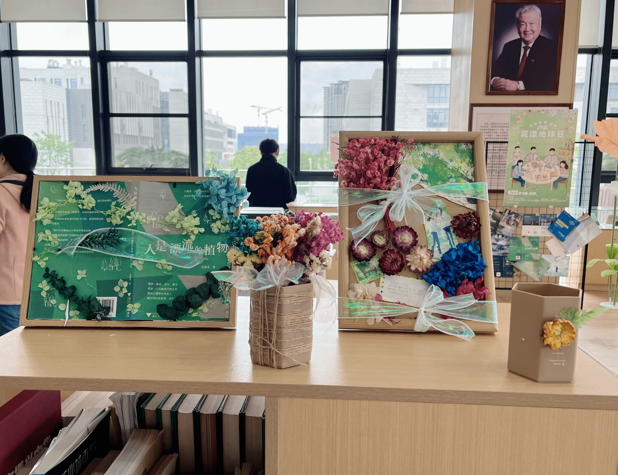 在废旧书封花韵创意DIY区域,同学们以图书馆图书加工过程中产生的废弃书封为创作基底,搭配干花、古诗词素材与笔墨,巧手制作书签、装饰画、手账本等文创作品。花韵点缀书香,旧物焕发新生,大家在动手创作中放慢节奏、舒缓心情,在动手实践中感受“惜物减废、变废为宝”的乐趣。