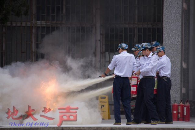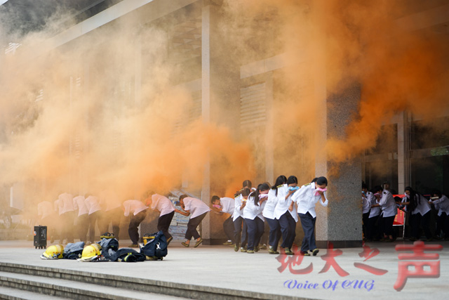 一阵橘色烟雾从主楼门口散出,消防演练正式开始。火场逃生演练中,40余名新生用毛巾捂着口鼻弯腰有序“逃出”主楼,全程不超过10秒钟。现场的消防队人员向同学们展示了云梯消防车的使用,快速地将第三层楼的被困人员救出,赢得了新生热烈的掌声。 第二个项目是教给大家灭火器的用法,新生们踊跃上台体验如何使用灭火器。关山消防支队的相关人员还为大家展示了消防水枪的用法和消防服装的穿戴。两位新生上台穿戴好消防服装并即兴进行了一场别样的“T台秀”,让消防演练也充满了趣味。