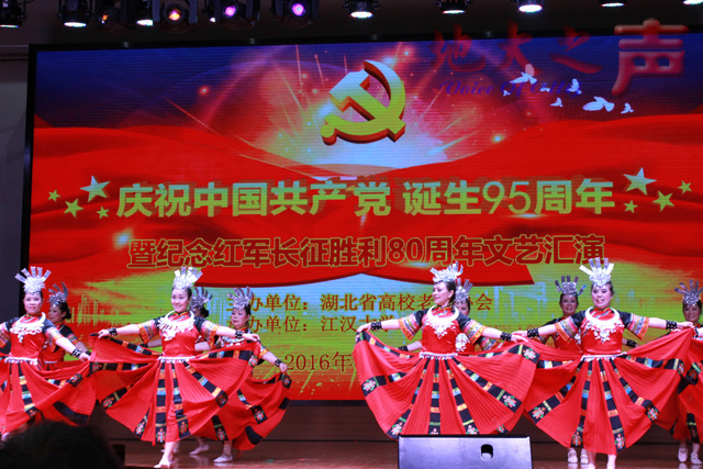 (通讯员于荣萍)6月22日上午,湖北省高校老年人协会庆祝中国共产党诞生95周年暨纪念红军长征胜利80周年文艺汇演在江汉大学举行,我校老协舞蹈队派出12人演绎舞蹈《一抹红》,赢得现场观众阵阵掌声。