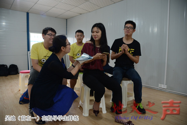 在这里,材化学院辅导员、星火话剧社的指导老师吴迪时不时地纠正学生在表演中的不足,有时还声情并茂地示范起来。