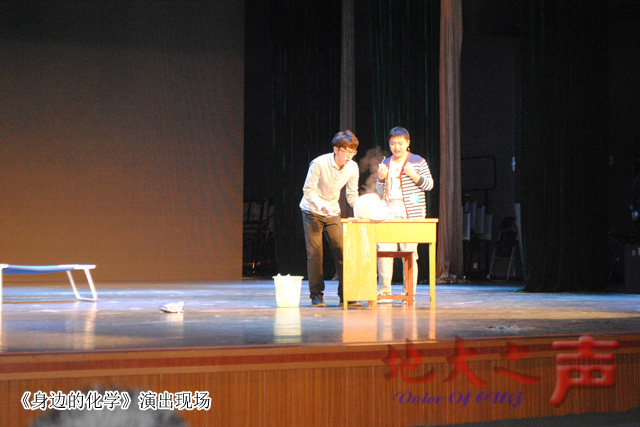 033142班的吕凌飞在《身边的化学》中扮演苗大雷,一个热爱化学、脾气火爆的东北爷们儿。记者看到,他在表演中收放自如,经常能自发和同学碰撞出火花来。他笑着告诉记者:“刚上大学时,我成绩一般,上课也很少发言。但在大三一次口语课上,我的声音比拿着话筒的老师都大,有同学问我,你怎么这么理直气壮?这可能就是话剧社带给我的改变吧。”