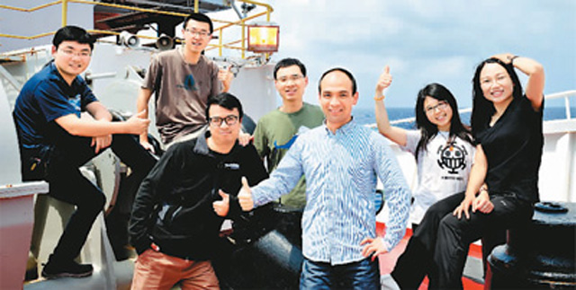 3月17日,参加第三次南海大洋钻探的中国“80后”在“决心”号上留影。新华社记者 张建松摄