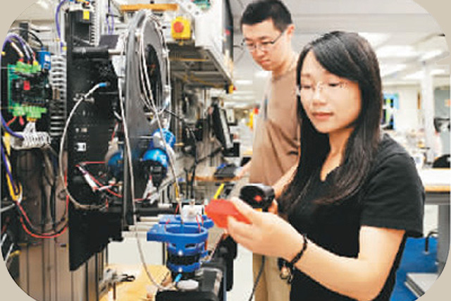 参加大洋钻探的“80后”张翠梅(前)和苏翔在检测样品。新华社记者 张建松摄