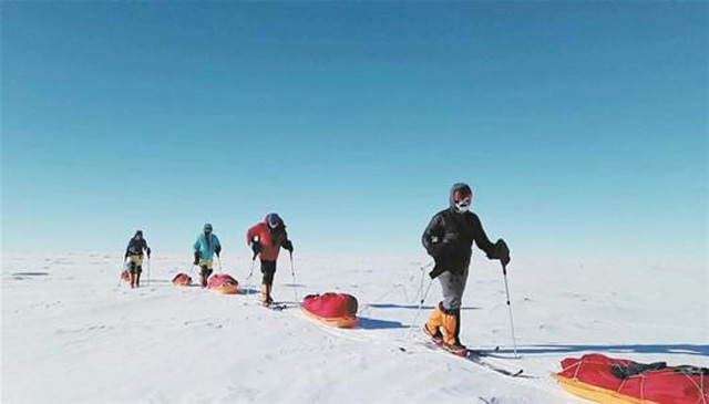 最考验人意志的不是寒冷、不是渺无人烟的苍茫,而是必须按捺住明知目标在前面,却还难以接近的急迫。12月23日,队员们远眺到一个黑点,他们行进了三个小时,当临时避难所出现在眼前,他们像泄了气的皮球一样明白过来——原来距离南极点还有二十几公里。“这种时候,只有鼓励大家加油,争取明天到。”12月24日,就在队员们情绪降至冰点,时不时因疲劳停下来休息时,董范这样为他们鼓劲。不断接近、接近,一度消失的小黑点再一次出现了,而且越来越多,队员们明白,这次真的要到极点了。12月25日,队员们终于抵达南极点。