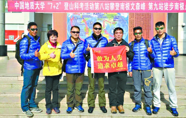 本报讯(记者邹谨 通讯员何鹏飞)今日,中国地质大学(武汉)登山队一行5人将离开北京,奔赴南极大陆,由本报与地大携手推出的“践行武汉精神 挑战地球九极”系列活动迎来收官之战。月内,“敢为人先 追求卓越”的武汉精神旗帜可望登上南极洲最高峰文森峰以及南极点。