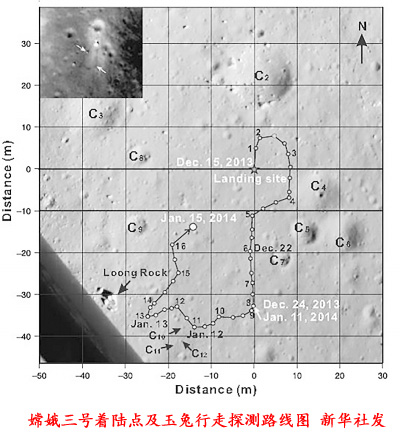 这篇以肖龙为第一作者的文章写道,嫦娥三号正好着陆在一个直径约450米的年轻的撞击坑边缘。“玉兔”车在这个撞击坑附近行走了约114米,并进行了两个月昼(相当于约28个地球日)的照相和雷达探测,最终获得了沿途一系列高分辨率影像和雷达探测数据。