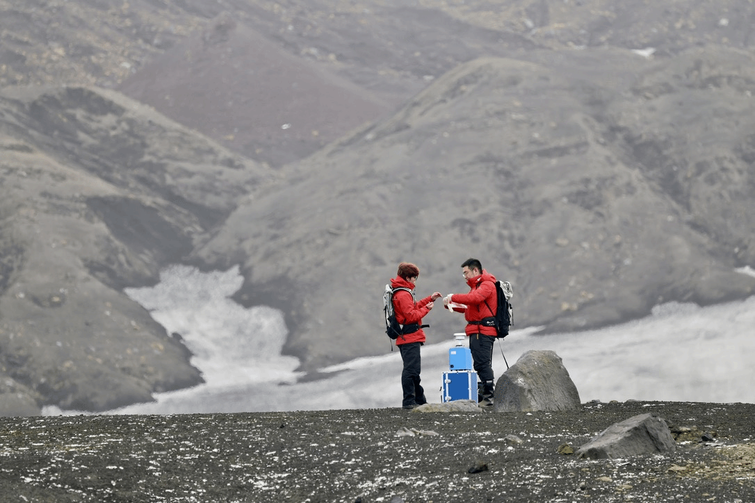 在南极欺骗岛,为了采集山顶土壤样品,师生两人迎着寒风往高处爬,为了保证无菌操作,只能戴着很薄的无菌手套开展工作,采完样之后,两人的手几乎冻僵,但还不能停下,需背着几十公斤的样品翻越山坡返回科考船。