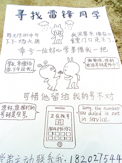 本报讯(记者翁晓波 通讯员张雅凡 吴擒虎)好心人雨天借伞,想归还却发现对方留的电话是“空号”。中国地质大学研一学生卯江明画了一张“寻找雷锋启事”,“萌意”十足。
