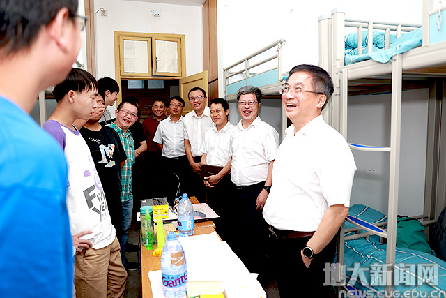 王焰新一行抵达秭归产学研基地后,随即到教室、宿舍和医务室看望慰问在站教师、学生和医护人员。走访过程中,王焰新关心实习工作开展情况和教师在实习期间的困难;查看学生野簿,询问学生在基地学习、生活情况,鼓励大家要克服困难,发扬“艰苦朴素,求真务实”的校训精神,以最好的状态投入野外实习中,在实践中练就过硬本领。