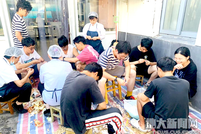在周口店实习基地,随着野外实践教学进入室内撰写报告阶段,7月31日起,30余名师生志愿者被分为四个小组,有的在后厨帮工,有的在室内打扫,有的在基地维护户外卫生……看到学生在工人师傅们的指导下认真劳动,地球科学学院辅导员滕笑丽在朋友圈写下:“摘菜剥蒜帮食堂阿姨做出美味的午餐,拔草清杂为实习师生营造整洁的环境,作为一名新时代地质人,出野爬山画图我们在行,劳动我们更在行。”