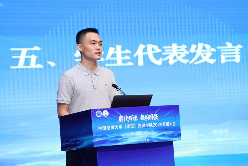学生代表、资源学院2024级博士研究生张启扬发言。他结合自身科研实践经历分享了成长体悟,他立志用专业知识服务能源资源安全保障,展现资源人的担当与使命,让青春之花在祖国最需要的地方绽放光彩。