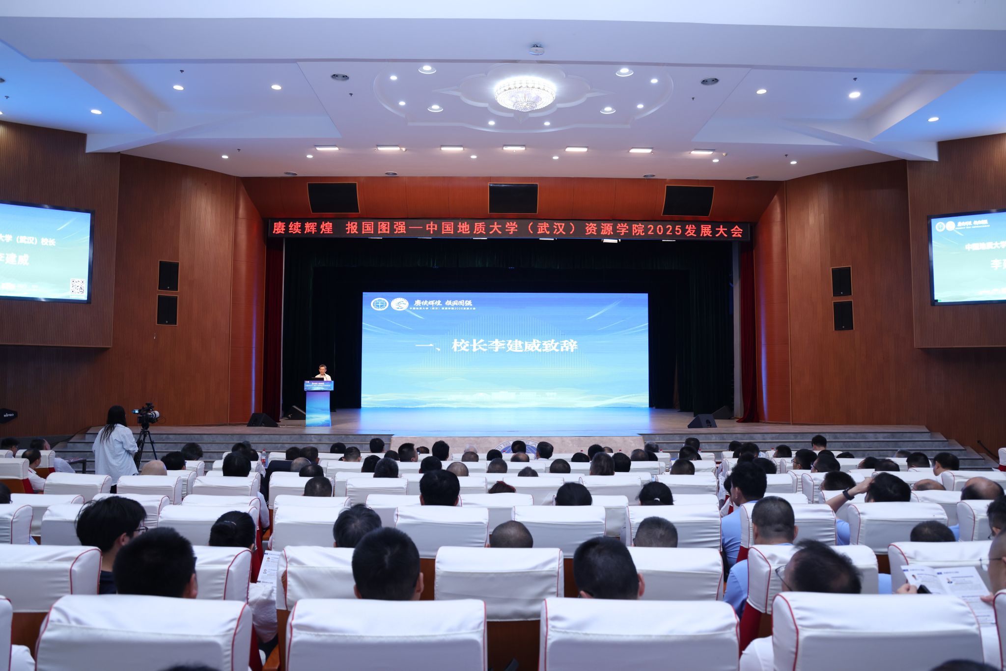 地大新闻网讯(通讯员 吴超 刘睿 摄影 王俊芳)赓续地质报国初心,勇担教育强国使命。10月2日下午,资源学院2025发展大会在南望山校区弘毅堂举行。全国政协委员、自然资源部原党组成员、中国地质调查局原局长、中国地质科学院原院长李金发,中国地质调查局油气资源调查中心主任、党委书记张作衡,中海油国际融资租赁有限公司/中海石油投资控股有限公司董事长朱闻达,中原油田副总经理、总地质师段金宝,自然资源部第四海洋研究所副所长雷吉江,中国地质调查局自然资源实物地质资料中心副主任张森,湖北省地质勘查基金管理中心主任李晶,浙江校友会会长丁晓冬,20家共建地质e站的合作单位代表,毕业30年、20年、15年、10年以及其他年级的校友代表受邀参会。校长李建威,党委副书记王甫,副校长胡守庚,党委常委、组织部部长陈文武,原校长张锦高,原副校长姚书振、邢相勤,各教学科研单位、管理服务机构负责人,干部师生代表及资源学院全体师生参加会议。