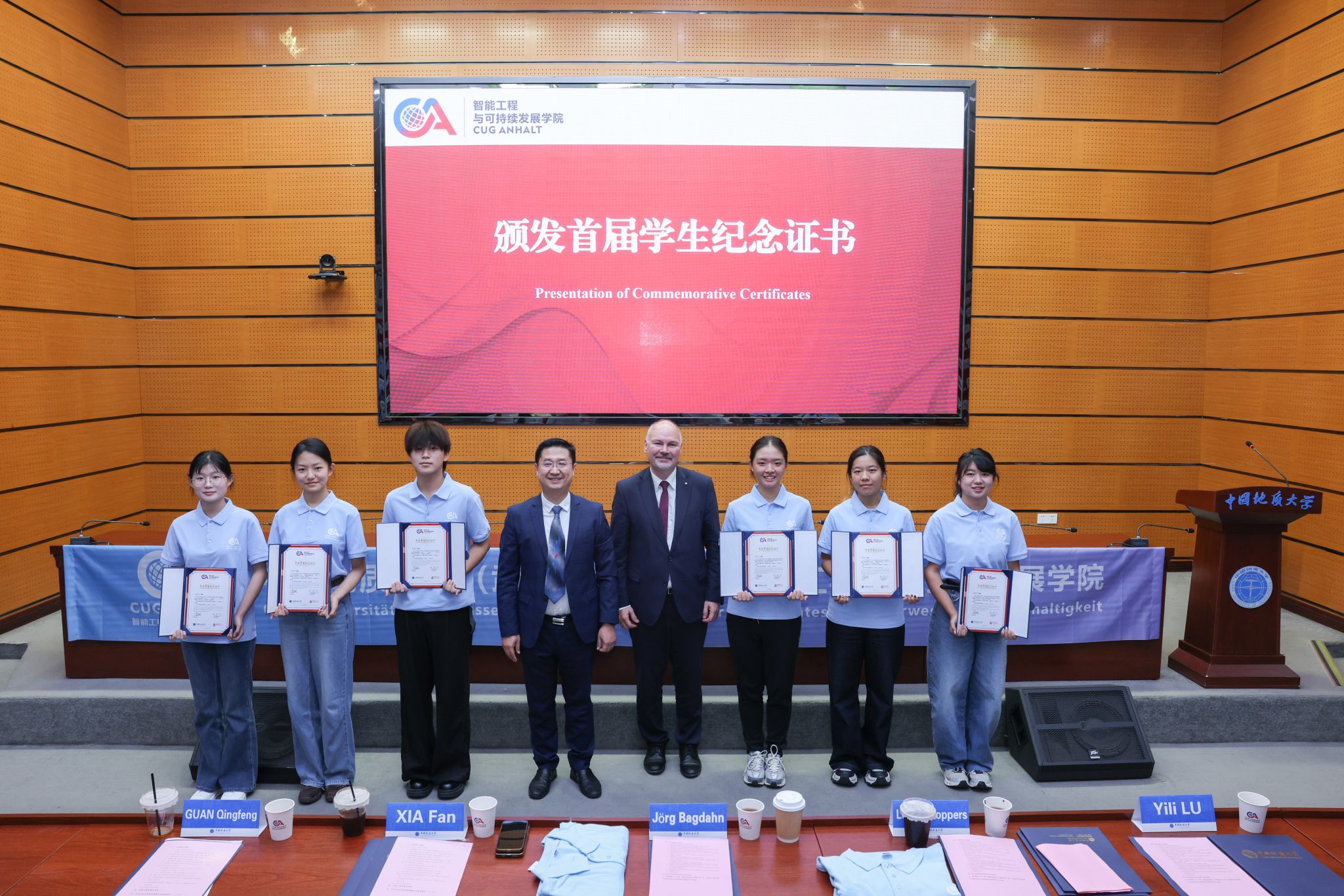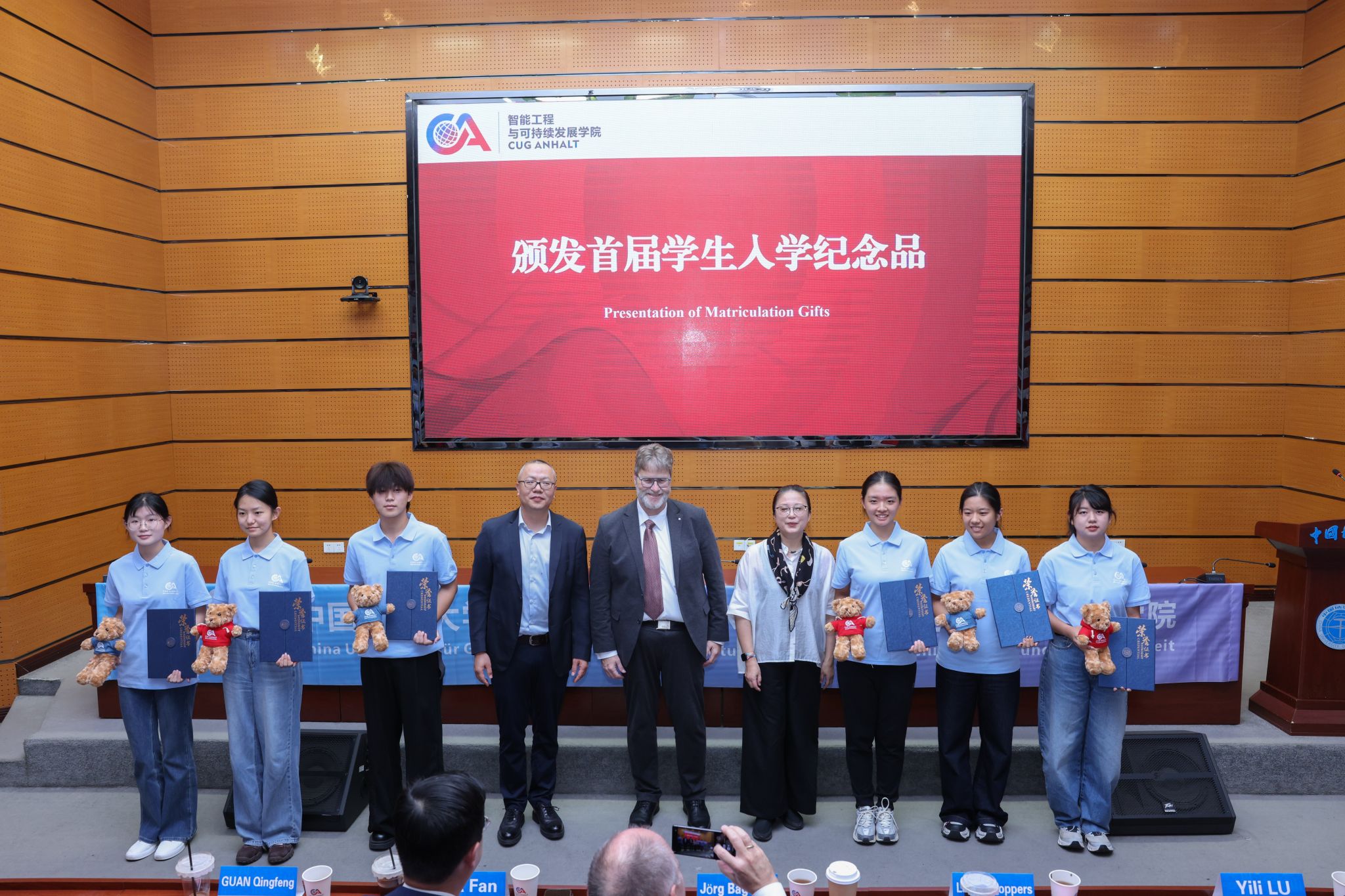 我校副校长、中德学院院长夏帆,安哈尔特应用技术大学校长约尔格·巴格丹、副校长路塔·库巴斯,中德学院德方副院长陆以理,我校本科生院、研究生院、学生就业指导处、团委、机械与电子信息学院、自动化学院、地理与信息工程学院、国际教育学院负责人,中德学院2025级新生参会。