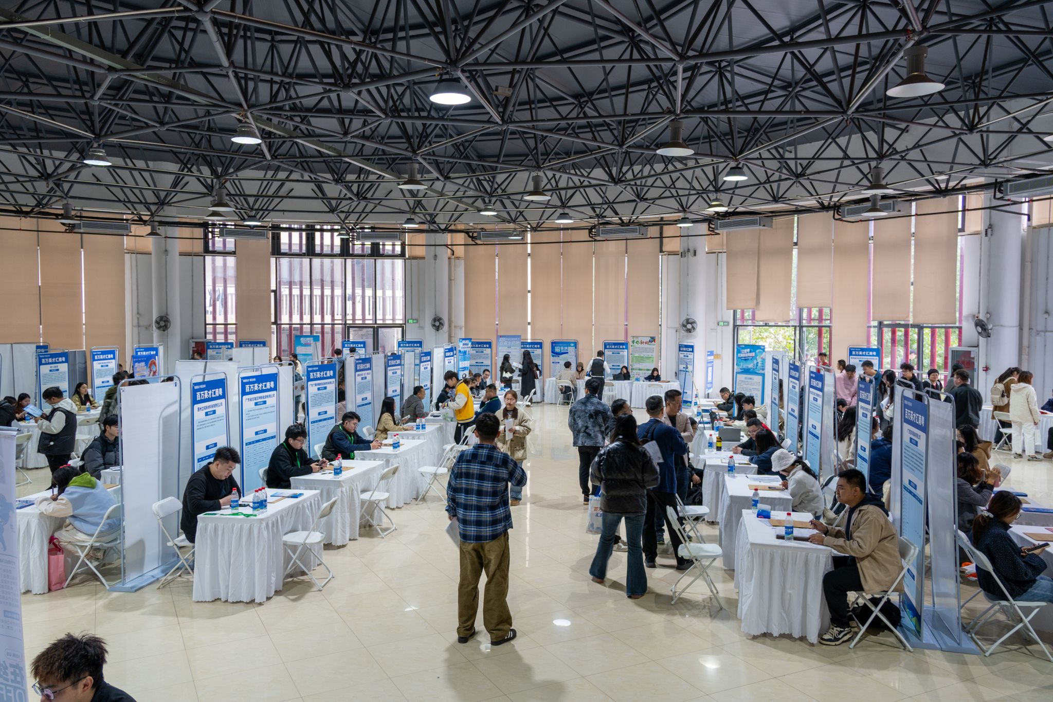 座谈交流会后,胡守庚陪同陈宇航一行前往大学生活动中心招聘现场,了解企业招聘需求和学生求职情况。