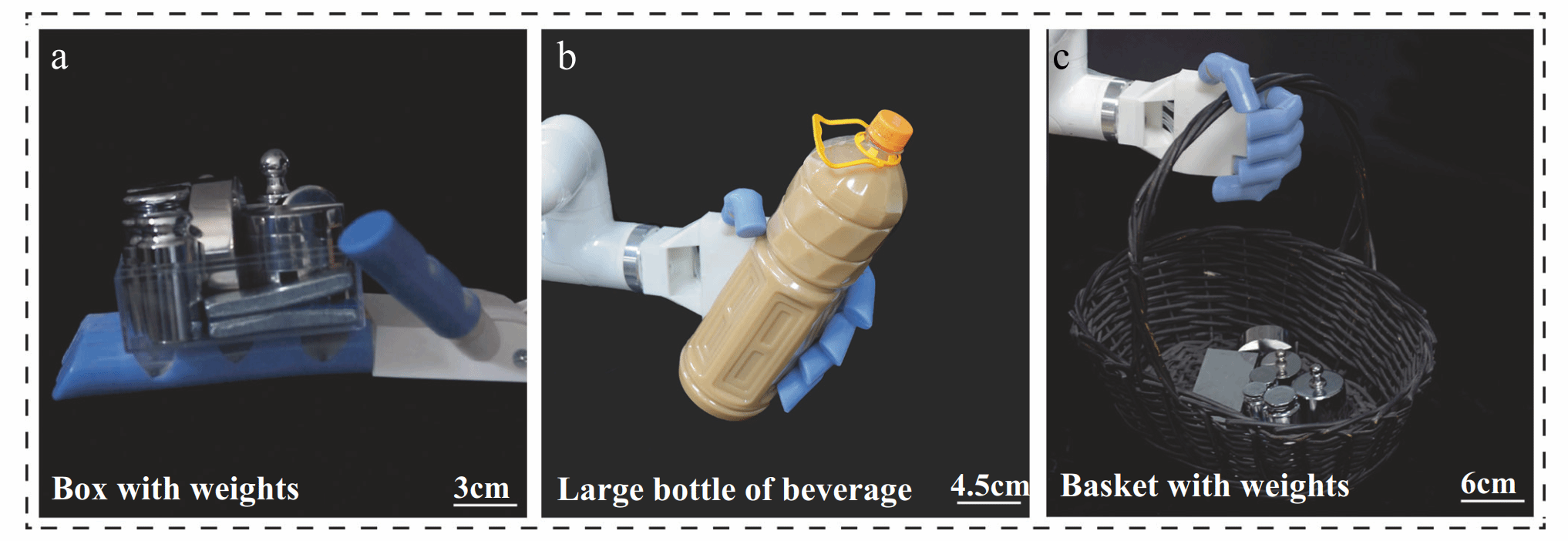 装有刚—柔—软结构手指的仿人机械手展示“托”“握”“提”仿人抓取模式