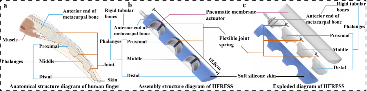 该研究设计的仿人手指由刚性管状骨骼、柔性关节弹簧、气动薄膜驱动器和软体硅胶皮肤组成。这种结构确保了该仿人手指的刚度和稳定性,同时使其具有类似人手的柔顺输出力。