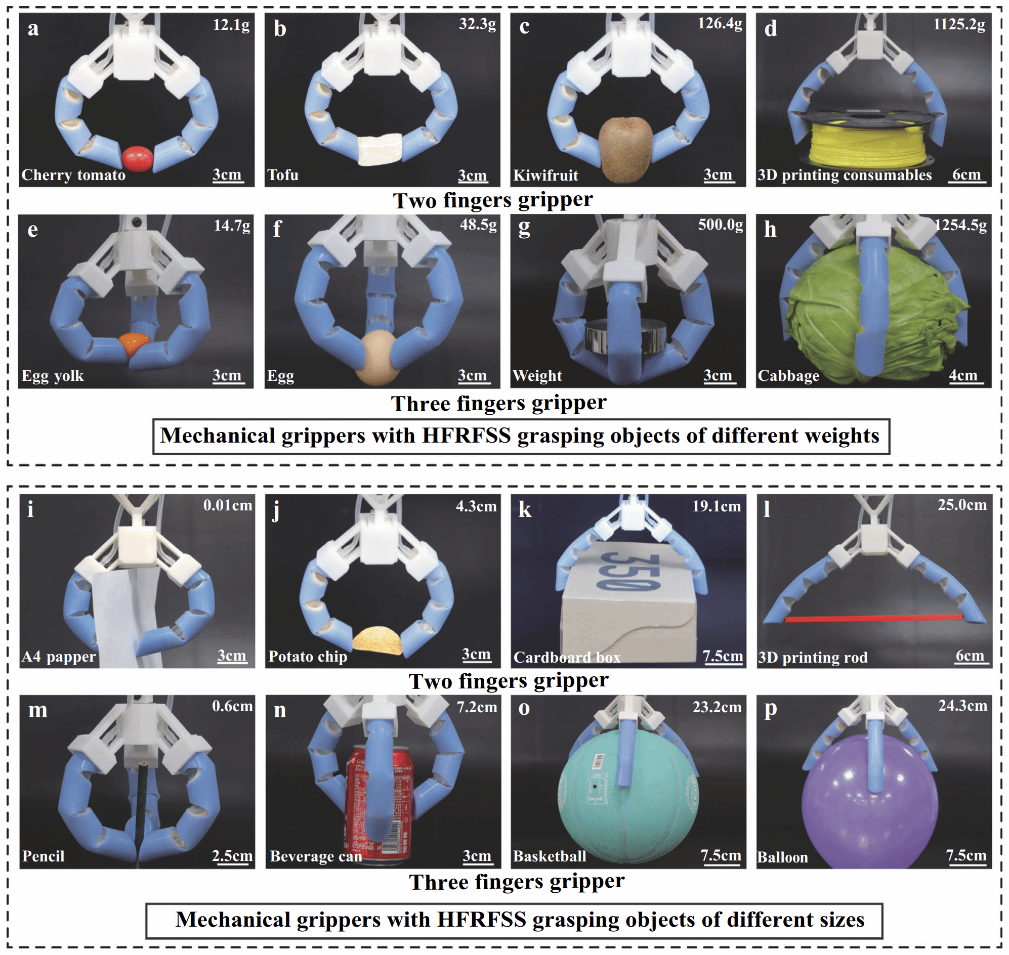 从12克的小番茄到1千克的3D打印耗材、从鸡蛋到卷心菜、从A4纸到气球、从三指抓取到双指抓取……研究团队通过大量实验,验证了装有该仿人手指的抓持器在不同质量、硬度、尺寸和形状的情形下具有良好的抓取能力。