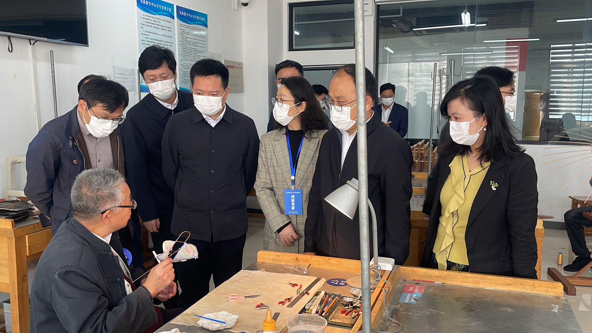 评审期间,湖北省经济和信息化厅一级巡视员周开斌带队来校,实地巡查各工艺类别实操考场,了解选手创作情况,并与我校副校长胡守庚、珠宝学院领导及评审专家交流。