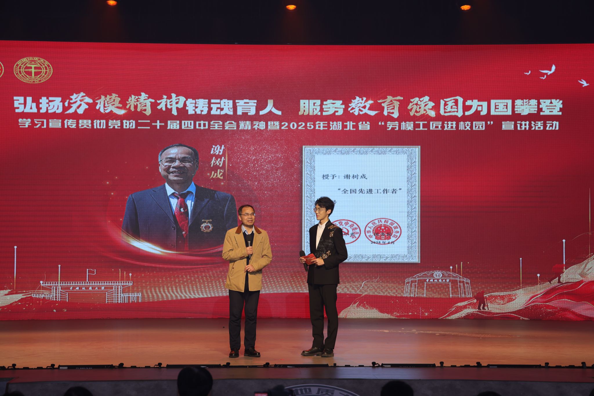 宣讲活动通过情景剧、事迹讲述等形式,对2025年“全国先进工作者”谢树成院士、梅顺齐教授、陈学东院士、陈守文教授的先进事迹进行宣讲展示,分享他们立足岗位、不懈奋斗的感人故事。