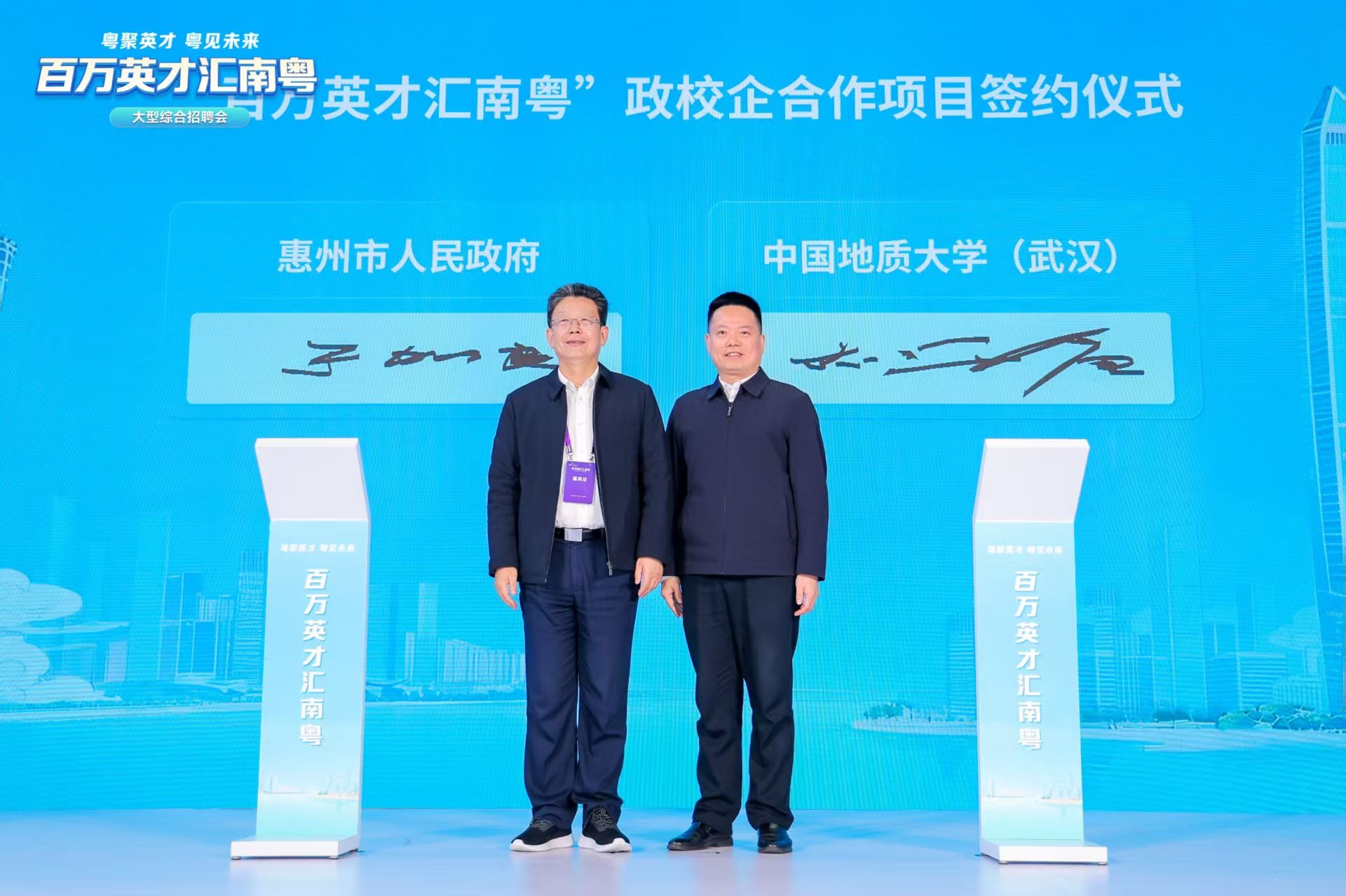 招聘会现场,胡守庚代表学校与惠州市人民政府签订校企战略合作协议,双方共同建立体现时代特色、符合时代要求的“政产学研用”校地合作新模式,提升高等学校支撑区域经济社会发展的能力和水平,助力惠州经济社会高质量发展,实现双方互促共赢。