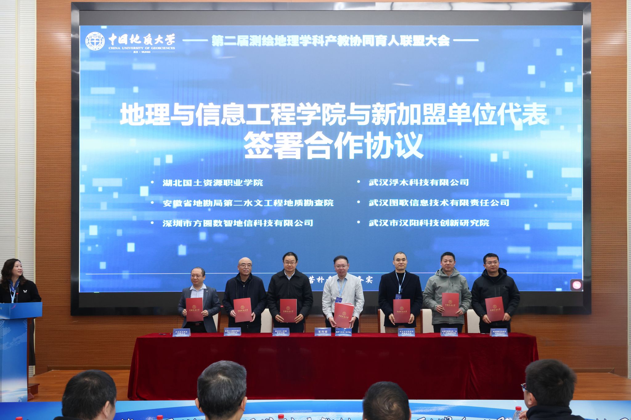 会上,为新加盟中国地质大学“地质e站”的六家单位揭牌。地理与信息工程学院与新加盟联盟单位代表现场签署合作协议,为新成员单位授牌,并为新聘校外企业导师代表颁发聘书。