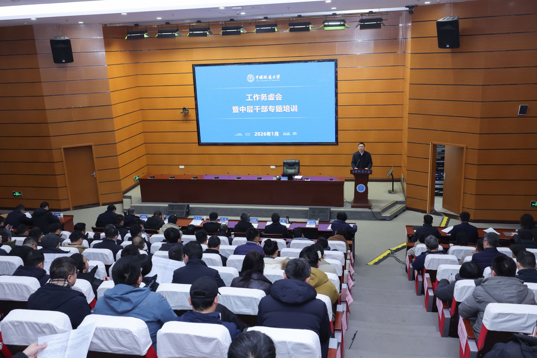 校党委书记刘杰主持培训并以《顺应时代大势 锻造过硬本领 奋力谱写地大高质量发展新篇章》为题作主旨报告。他指出,全体干部教师要深刻把握高等教育在强国建设中的历史使命,将学校发展主动融入国家战略全局;要清醒研判当前学校面临的内外形势与风险挑战,在机遇与考验中坚定发展方位;要坚持以问题为导向,通过深化改革破解发展瓶颈、激发内生动力。他强调,中层干部作为“关键少数”,须发挥“领头羊”作用,自觉强化担当、提升能力,真正成为推动学校事业高质量发展的中坚力量。