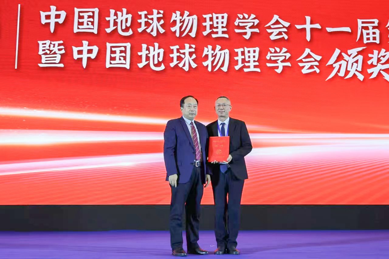 2025年,胡祥云(右)获中国地球物理学会科学技术创新奖一等奖