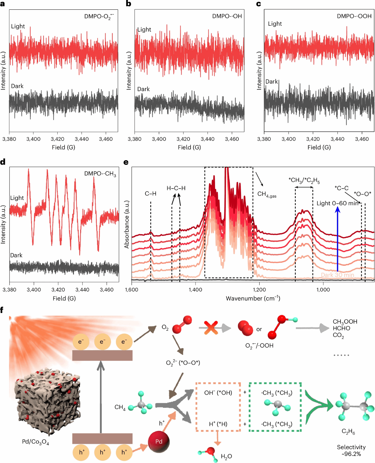 研究中揭示,该体系独特的能带结构有效抑制了超氧、羟基和过氧羟基等高反应性自由基的生成,转而引导氧气优先转化为温和的过氧物种;该物种与光生空穴协同参与甲烷活化过程,有效避免了传统自由基主导路径中常见的过度氧化问题。在温和条件下,该体系实现了甲烷向乙烷的高效转化,乙烷选择性达到96.2%,展示了通过全光谱利用与活性氧物种调控实现甲烷高选择性光催化转化的可行策略。