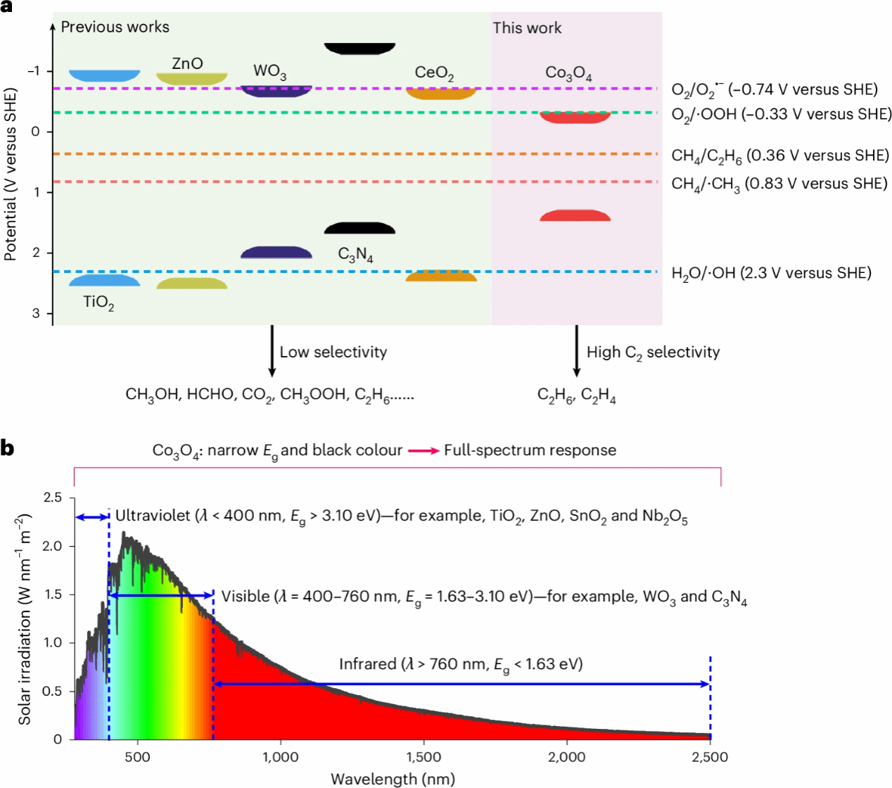地大新闻网讯 近日,我校材料与化学学院太阳燃料研究团队余家国教授、徐飞燕副教授与西班牙瓦伦西亚理工大学赫尔梅内希尔多·加西亚教授、中国科学技术大学郑旭升教授合作,在国际著名学术期刊《自然·催化》(Nature Catalysis)上发表了题为《全太阳光谱四氧化三钴光催化剂:活性氧物种精准调控实现甲烷高选择性转化》(Co3O4 as Full-Solar-Spectrum Photocatalyst for Selective Methane Conversion by Reactive Oxygen Species Control)的研究成果。