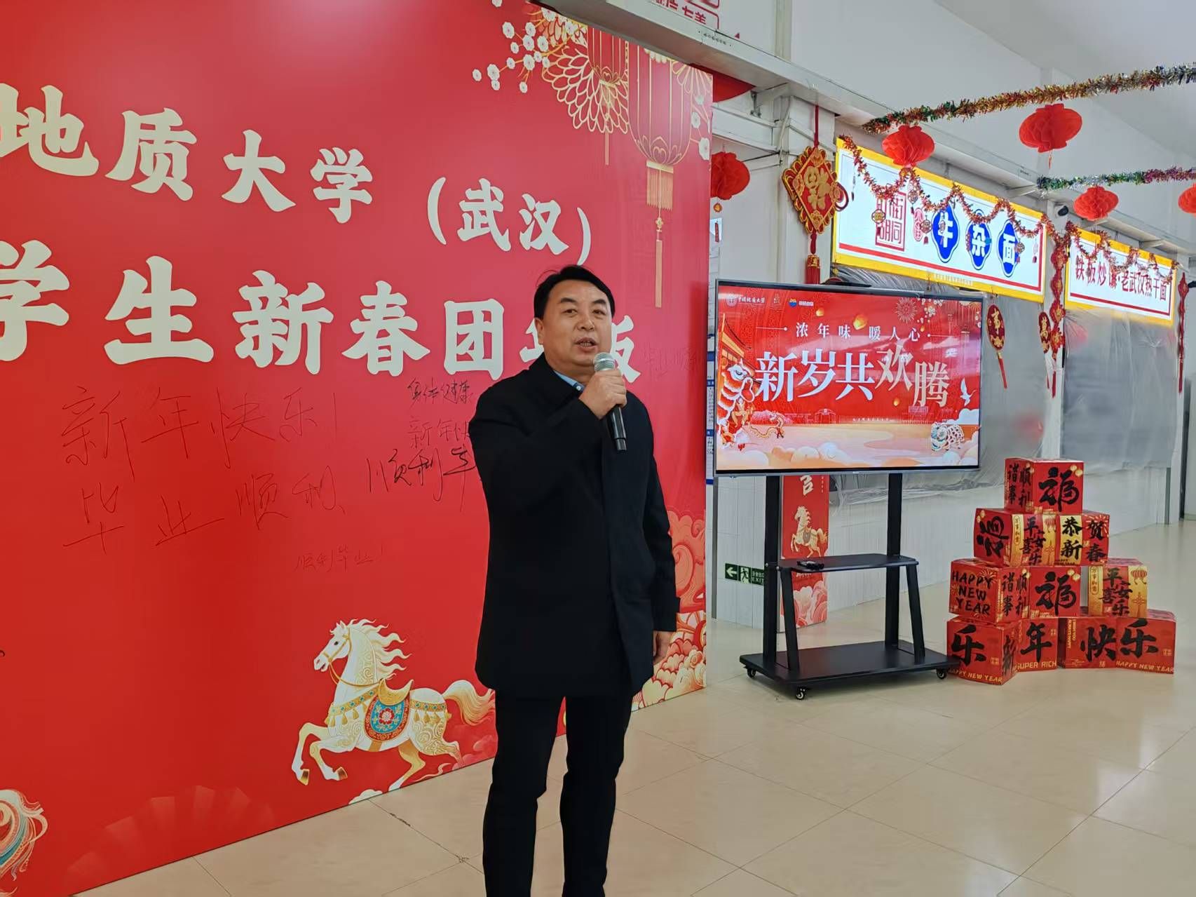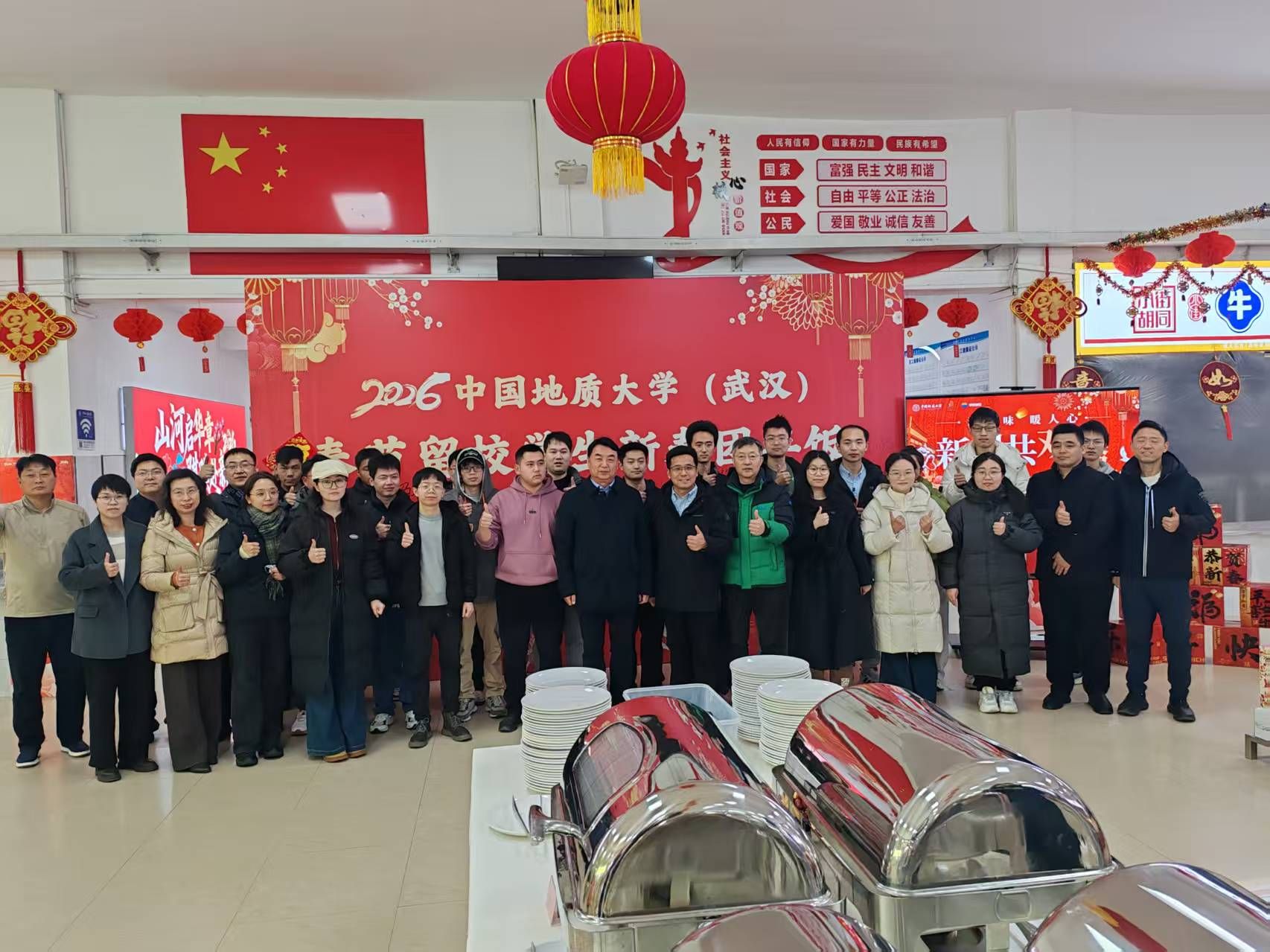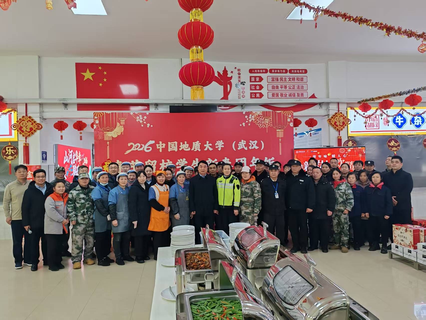 地大新闻网讯(记者 陈华文 通讯员 于婧)2月16日(除夕)中午,我校在南望山校区学三食堂开展春节留校学生团年饭慰问活动,为23名留校学生送上新春的美好祝福与暖心关怀。副校长王文起,学校办公室、本科生院、研究生院、后勤保障部、未来城校区管理办公室等有关单位负责人,以及留校学生所在单位相关负责人与同学们欢聚一堂,共度温馨除夕。本次活动由党委学生工作部部长朱丹主持。