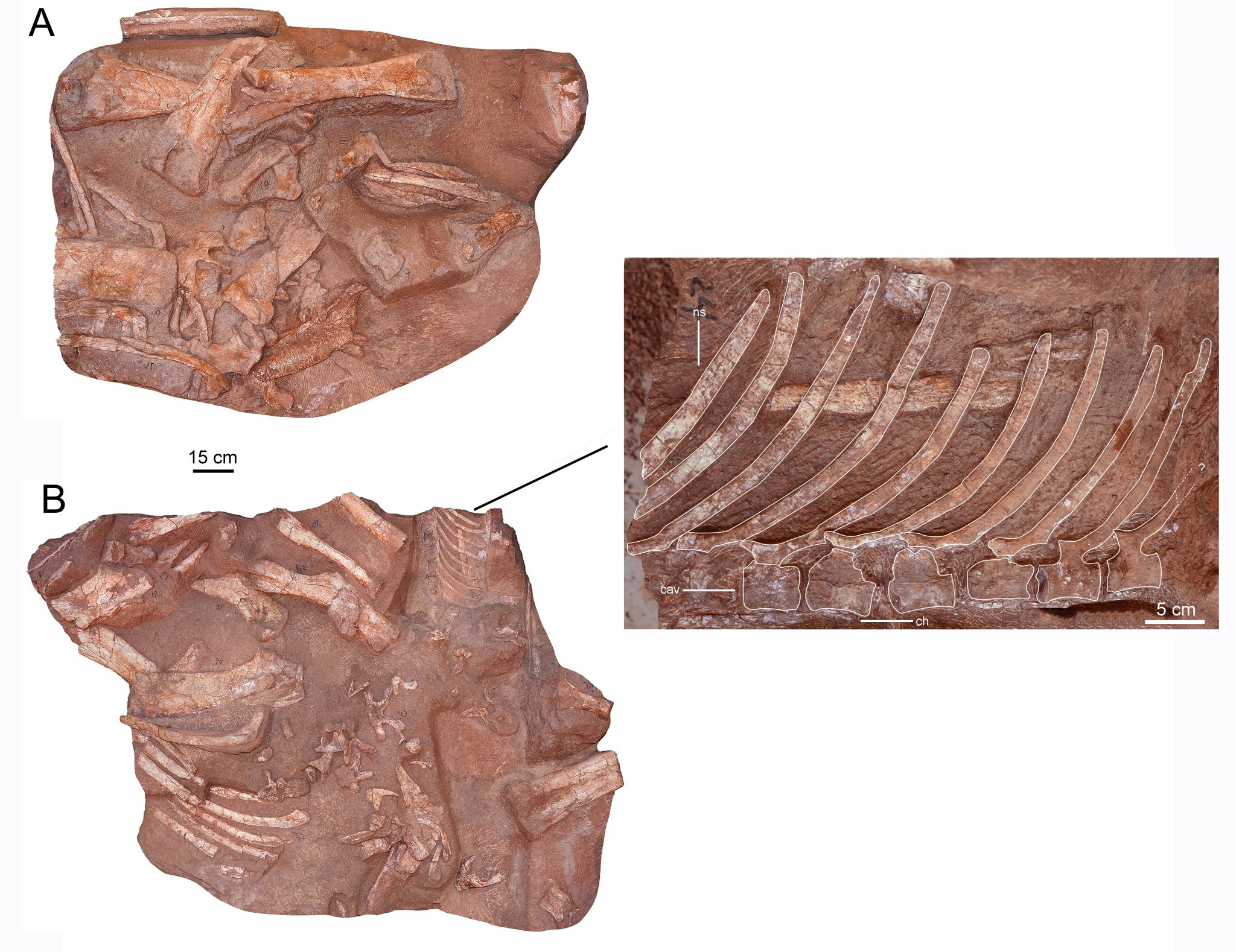 图2 帆尾贡水龙骨骼标本(A,B)及特殊“帆尾”(右),采自赣州市章贡区