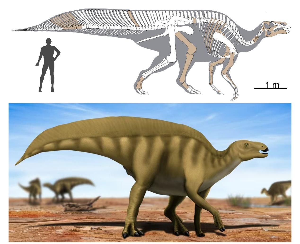 研究团队在详细骨骼形态分析中发现,该恐龙具有独特的形态组合,尤其是尾部特征极为特殊:其尾椎神经棘显著延长,其长度与椎体高度之间的比值达到了惊人的8.5,形成类似 “帆状” 的结构,这也是 “帆尾” 种名的由来(图2)。这种帆状尾结构在鸭嘴龙类中属首次发现,拓展了学界对鸭嘴龙类形态多样性的认知。