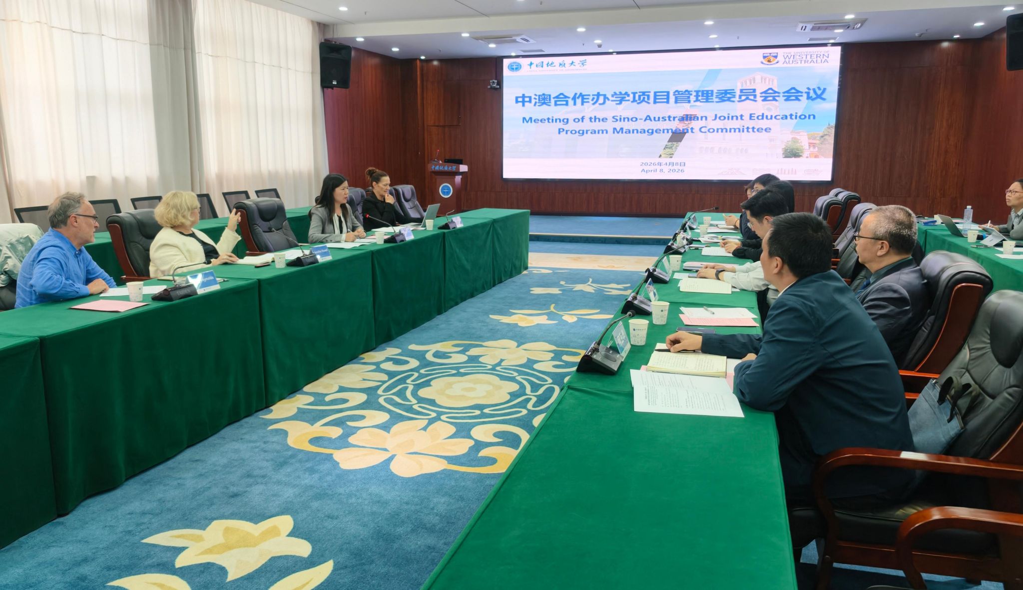 地大新闻网讯(通讯员 朱密华)4月8日,我校与澳大利亚西澳大学数学与应用数学中外合作办学项目管理委员会2026年第一次会议召开。西澳大学副校长詹妮弗·豪厄尔,协理副校长玛吉・蒋,物理数学与计算科学学院院长马克・雷诺兹等代表团成员,我校副校长夏帆,国际合作与交流处、本科生院、财务与资产管理部、数学与物理学院相关负责人参会。会议由国际合作处副处长范陆薇主持。