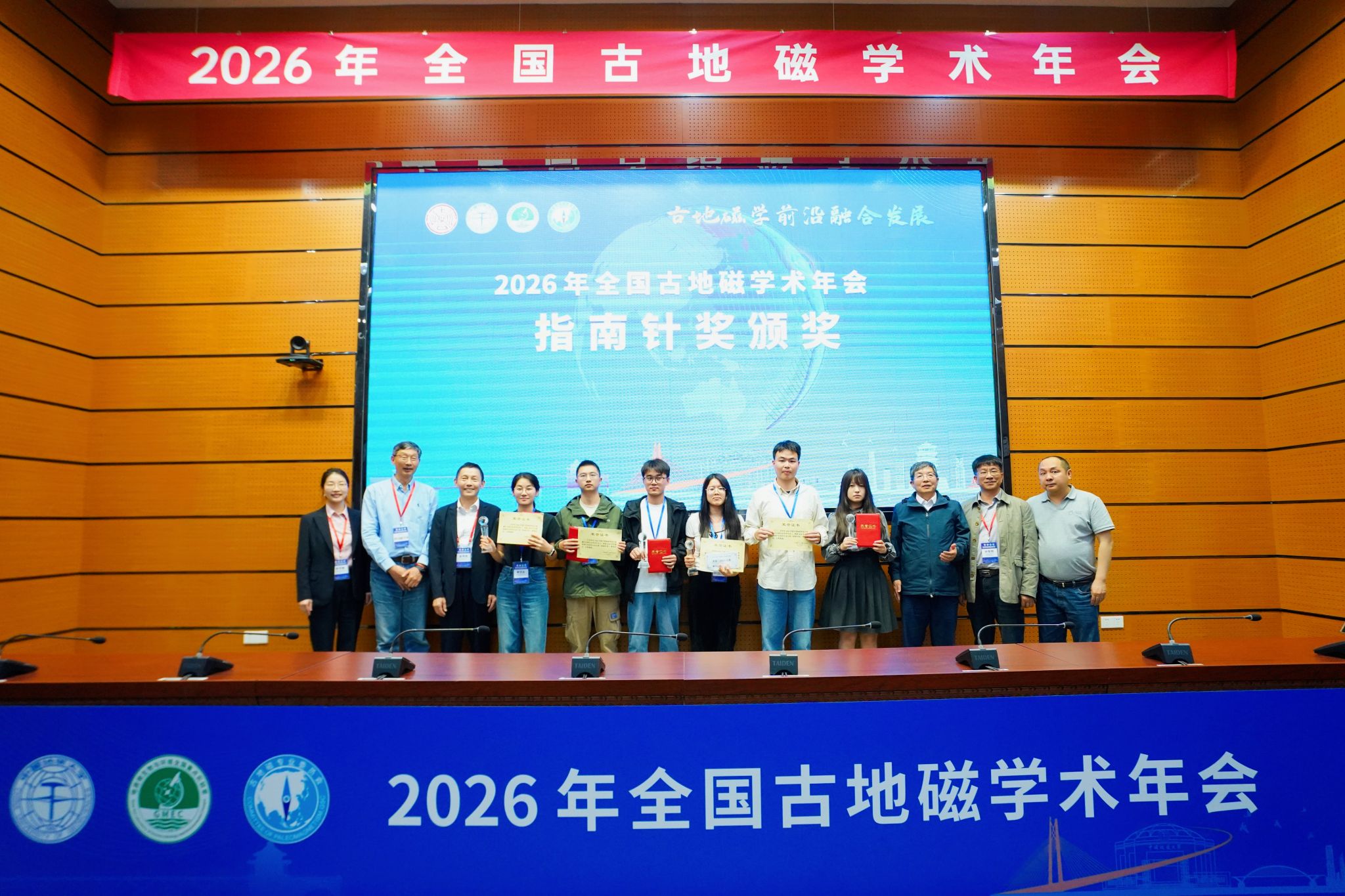 大会期间还开展了优秀学生报告/展板评选活动,共评选出6名获奖者并授予“指南针”奖,潘永信院士为获奖者颁奖,鼓励青年学子深耕古地磁领域、勇攀学术高峰。最后,会议举行会旗交接仪式,本次会议主办方代表朱宗敏教授将会旗传递给2027年年会承办方代表、西北大学程鑫教授。