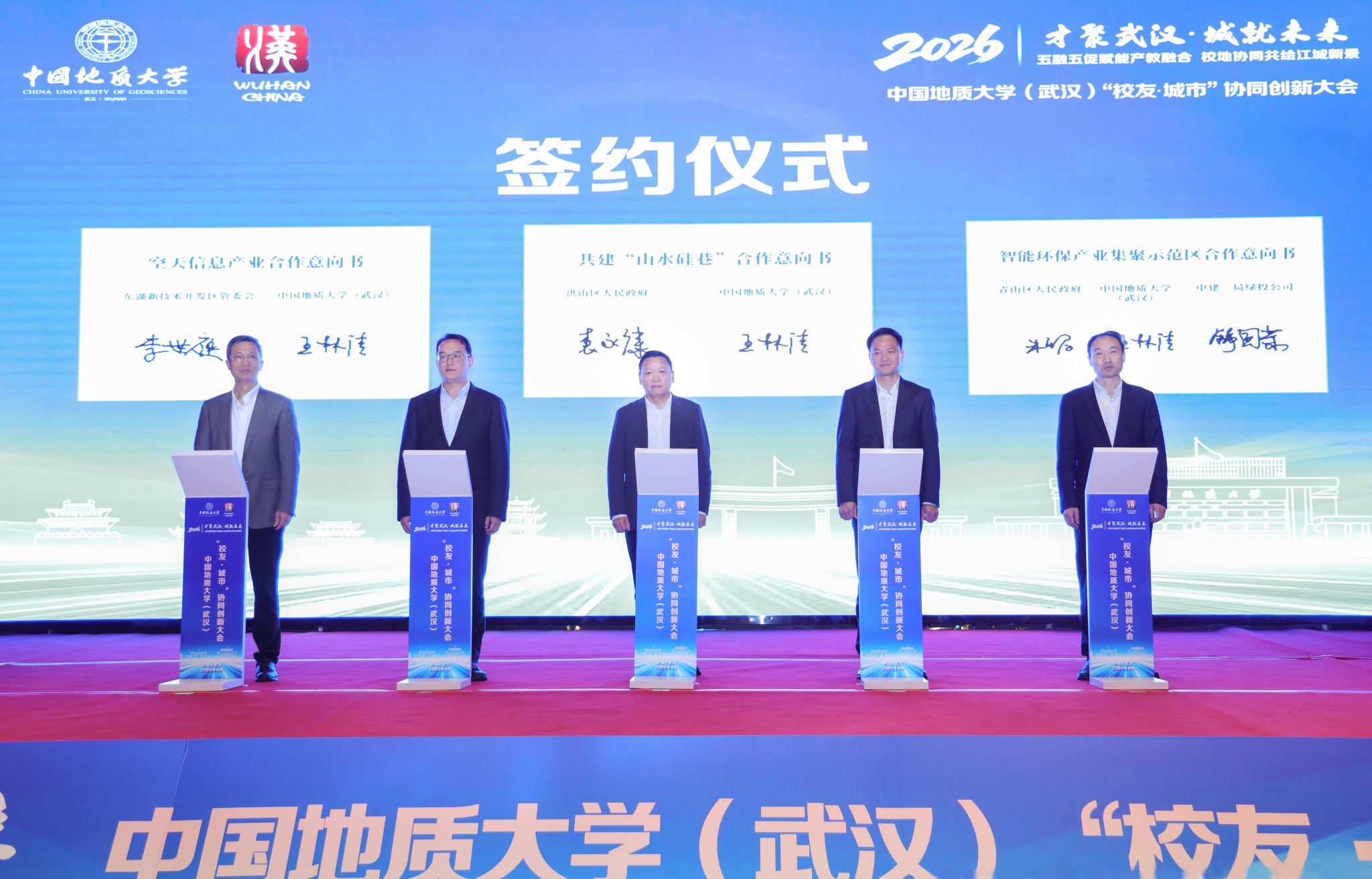 现场举行签约仪式,我校与东湖高新区、洪山区、青山区签订合作意向书,共同推动空天信息产业、“山水硅巷”、智能环保产业集聚示范区等项目建设。我校党委副书记王林清,武汉化工区党工委委员、管委会副主任、青山区政府党组成员朱仕君,洪山区政府党组成员、副区长袁永康,东湖高新区科创局副局长李春龙,中建三局绿投公司党委副书记、工会主席舒国荣代表签约。