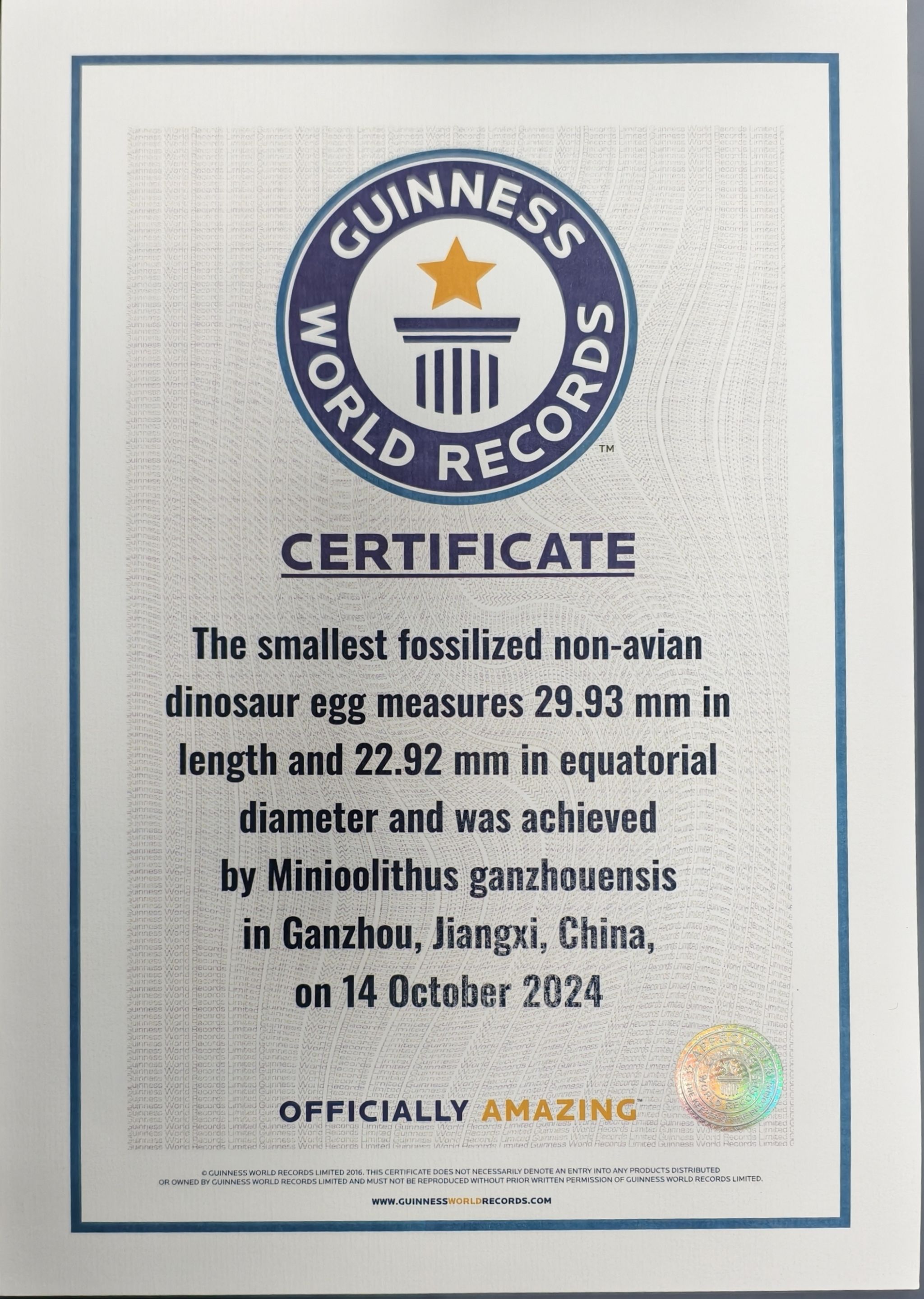 地大新闻网讯(通讯员 余淳梅)世界最小的恐龙蛋有多小?发现于江西赣州白垩纪晚期的“赣州迷你蛋”(Minioolithus ganzhouensis)2026年3月正式通过吉尼斯官方认证,4月16日取得纪录保持者证书,打破了此前由日本保持的4.5厘米的世界最小恐龙蛋纪录。